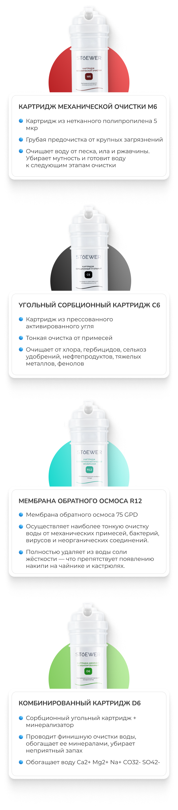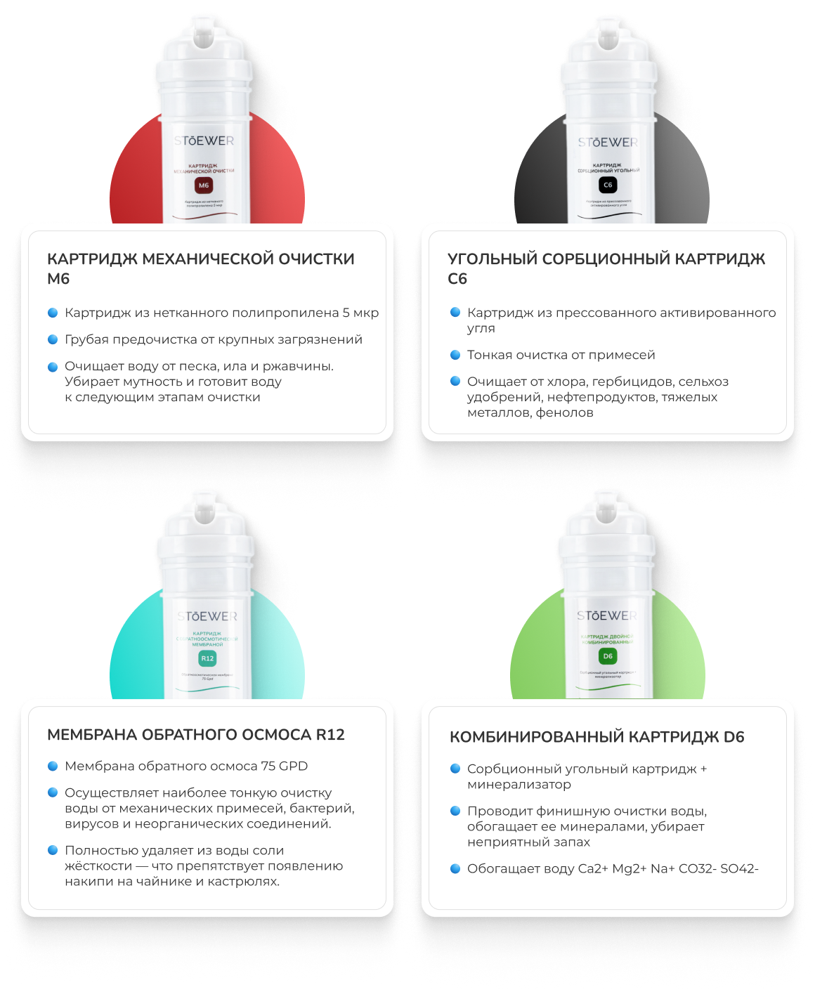 STOEWER Aqua A7 очищает воду с помощью 4 картриджей, которые продаются вместе с фильтром в комплекте. У каждого картриджа — своё назначение.